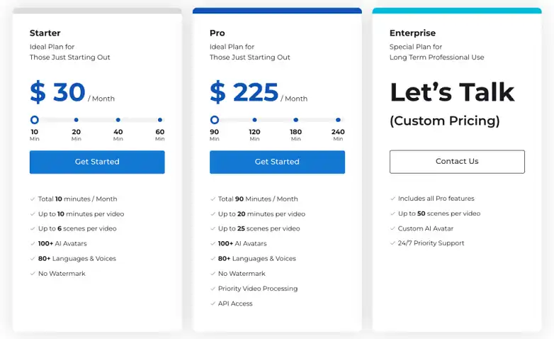 In this plan, you can have up to 25 scenes per video, 100+ AI Avatars, 80+ Languages & Voices with no watermark, priority video processing, and API Access.