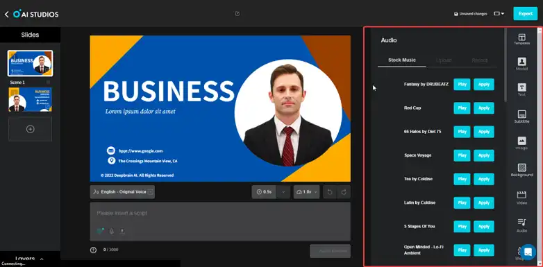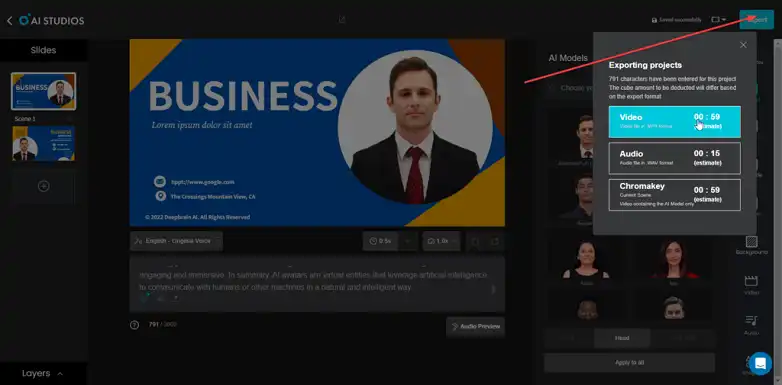 Step 8: Listen to the audio preview once your video is ready. In this stage, your avatar won’t move or you won’t see any animation. Don’t worry, click on “Export” and it will take around 3 minutes to render a 1-minute video.
