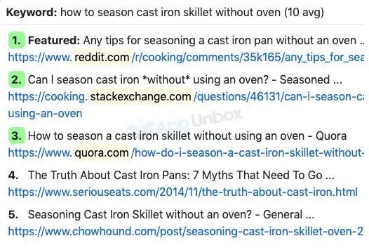 SERP checker is another great feature of Keyword Chef. Now, you don’t need to search each keyword manually and find out which can rank. Because, it automatically scans each keyword from the search result and identifies any ranking forum or websites such as LinkedIn, Quora, etc. It also shows a list of the currently ranked keywords in the top 10 websites.