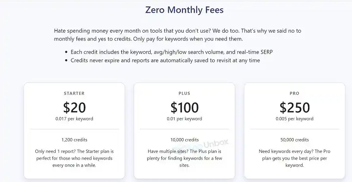 The pricing structure of Keyword Chef is Credit System. It means you don’t have to pay any monthly fees for this tool. You only need to buy credits and they never expiries. Even you can view your report as much as you want without spending any extra credits.